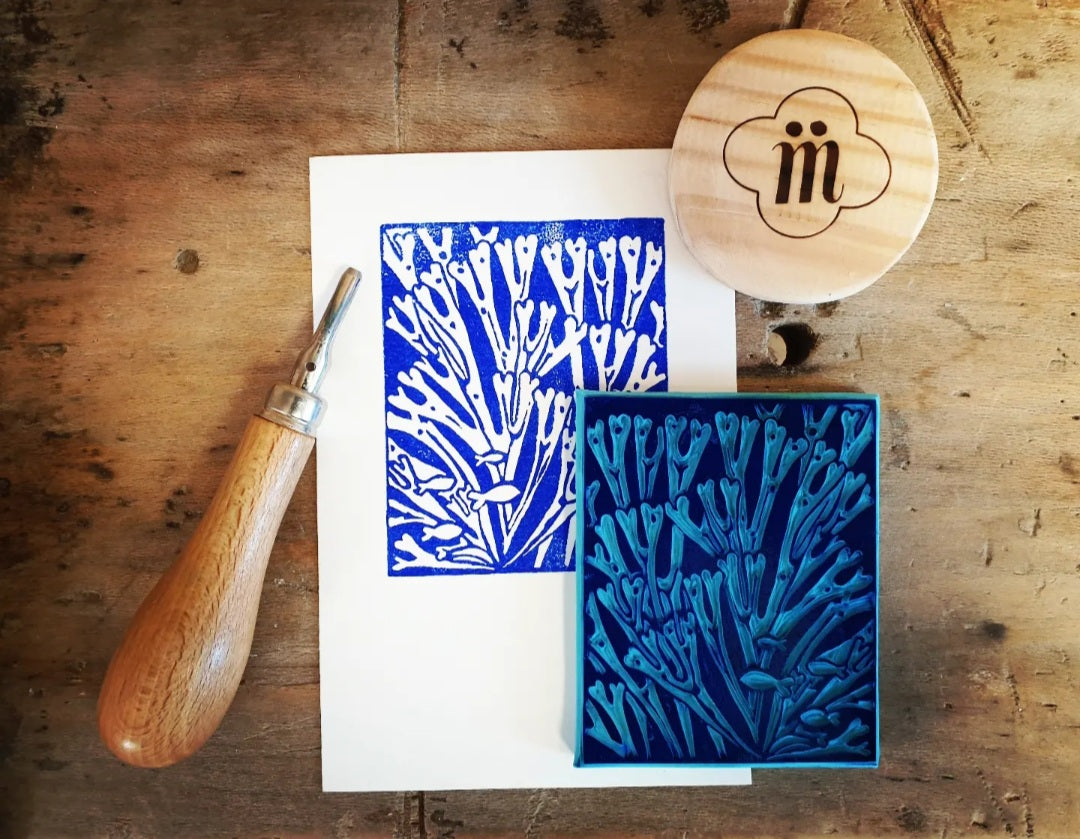 Viendra alors mon moment préféré : la 1ère impression ! Quelques coups de gouge pour ajuster et supprimer les derniers artéfacts et la matrice est prête ! Il s’agira ensuite de bien caler la feuille d’impression, encrer la matrice au rouleau et enfin presser à la force des bras ! Chaque impression est ainsi rendue unique selon l’encrage et la force appliquée.
