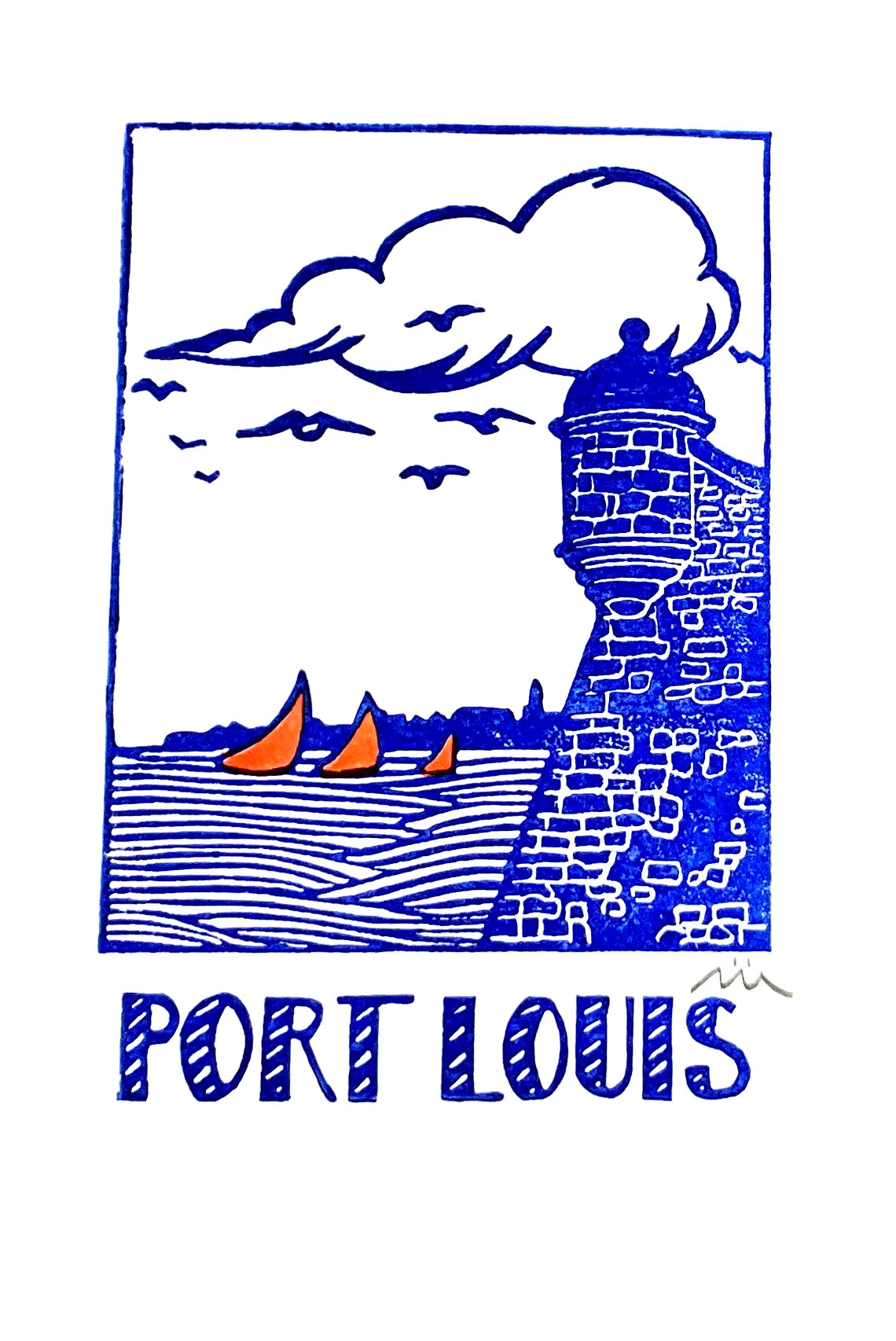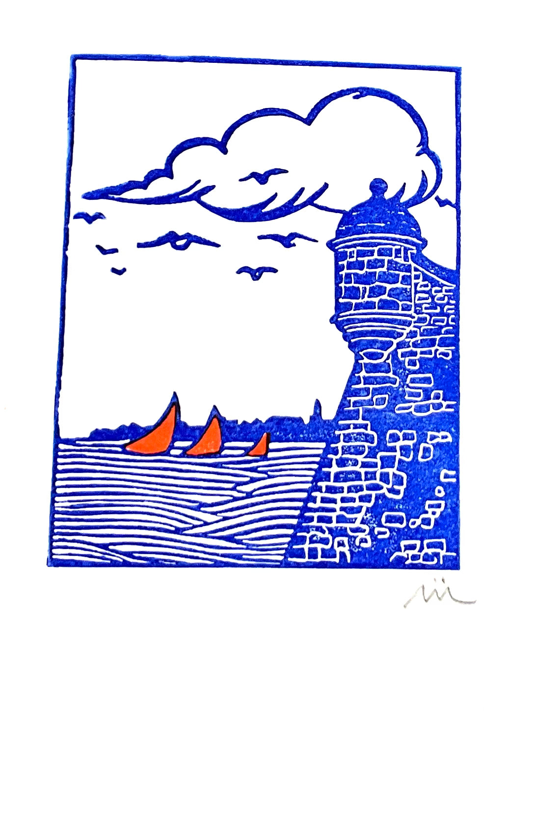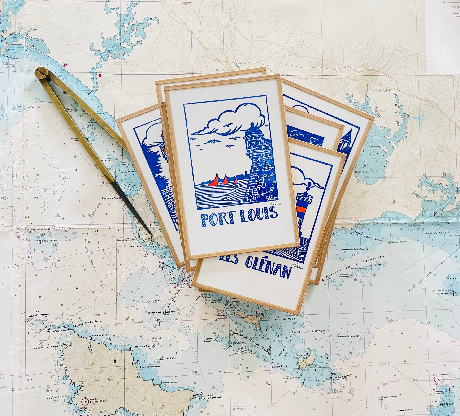 Impression originale réalisée à la linogravure sur gomme. Dessin, gravure et impression réalisés par mes soins dans mon atelier Finistérien - vendu sous-verre avec encadrement bande Kraft - Attention : chaque impression étant réalisée une par une à la force des bras, il peut y avoir des nuances d'encrage. Il ne s'agit pas de reproductions.